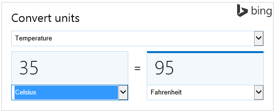 Or you can simply type, 35 Celsius in Fahrenheit and Bing will show automatically show the result in its Unit Converter.